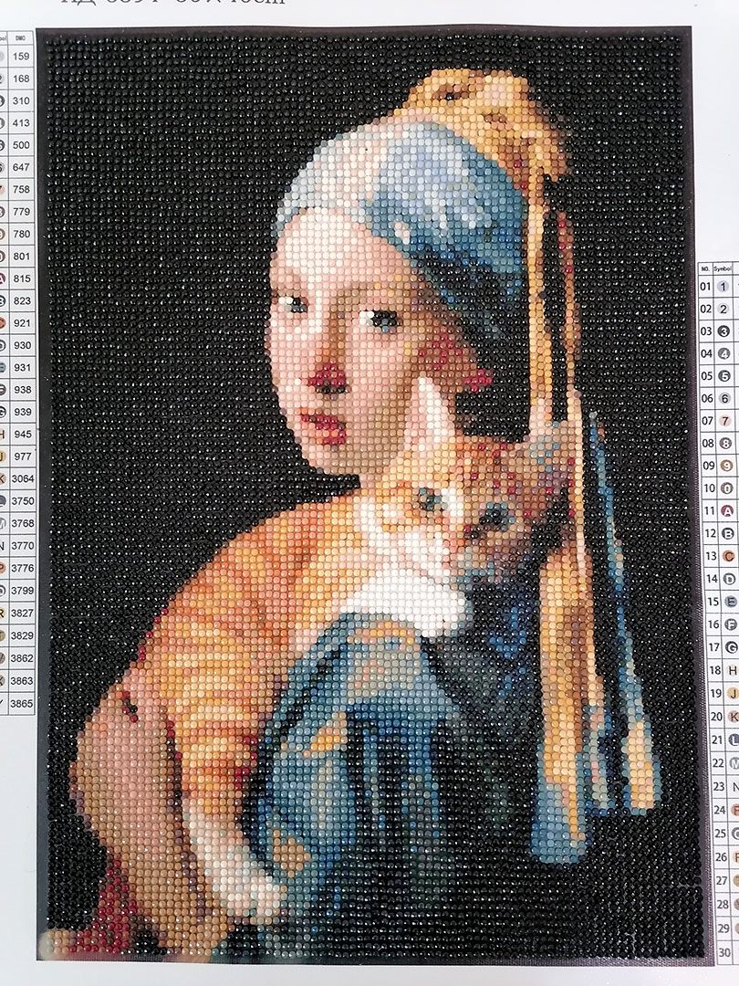 К концу года успела доклеить алмазную мозаику «Девушка с котом». Исходником послужила фотография — косплей на одну из наиболее известных картин нидерландского художника Яна Вермеера.