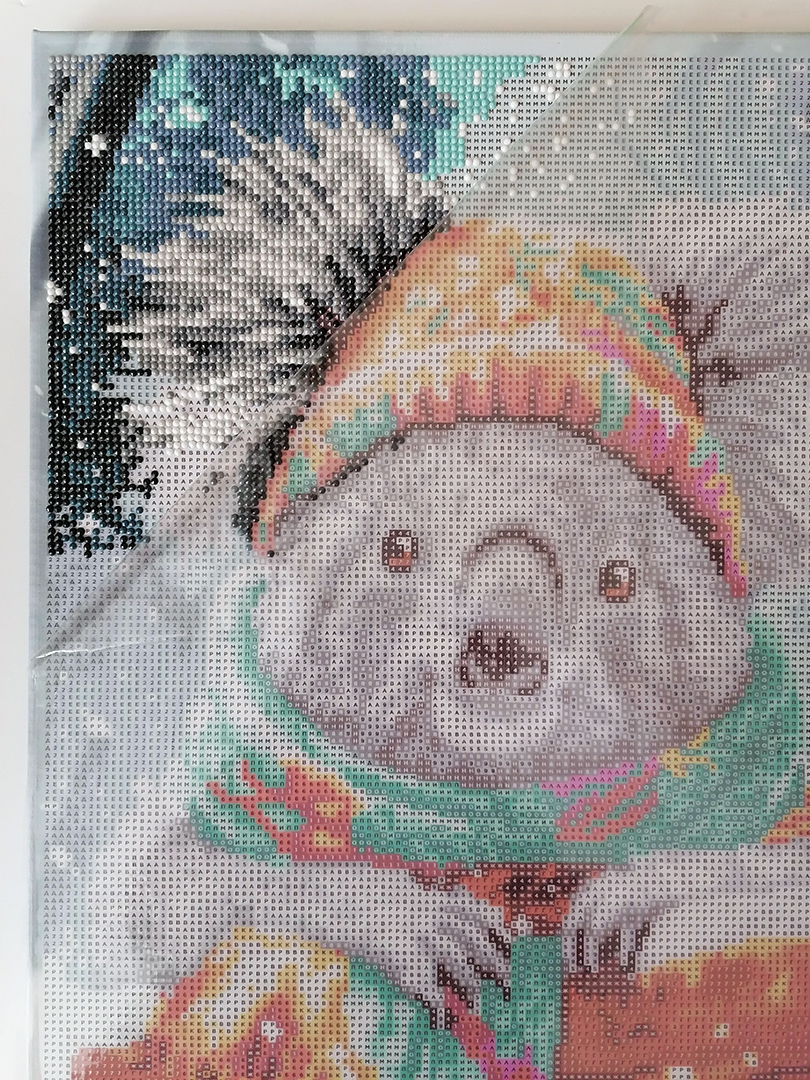Клей держит, ттт, начала с верхнего левого угла, единственное минусовое — размер холста, неудобно держать. Опять же, из-за большого размера не получается выдержать ровные ряды, где-то получается косо, потом постараюсь линейкой выправить. Из плюсов — само изображение укреплено на подрамнике и есть какая-то плотная подложка, боялась, что ткань будет просто натянута и провисать со временем, но она проклеена и плотная, удобно. Из минусов — на промофото заклеенный рисунок уходит за края полотна. В реале же рисунок отстает от полотна, и по краю идет клеевая полоса, Которая не обозначена под номера страз, и подозреваю, что их не хватит на дополнительное обрамление, т.е. по краю так и останется пол-сантиметра клея. На который со временем осядет пыль. Подумаю, что можно с этим сделать, если останутся стразы, постараюсь ими заклеить.