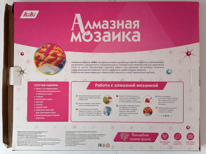 Понравилась прорисовка, но не ожидала, что будет такой большой размер, хотя и видела его в описании. Производитель не совсем понятен, нашла лейбл «Kiki», хотя сделано явно в России, адрес выпуска Иркутск.