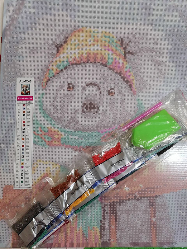Понравилось наполнение — оно было абсолютно полным, включая необходимые мелочи. 24 запаянных пакета со стразами, 25 пустых пакетиков для пересыпания, наклейки 24 цифры, двусторонний стилус (на 1 и 3 страза) поддон, плашка-ключ с обозначениями.