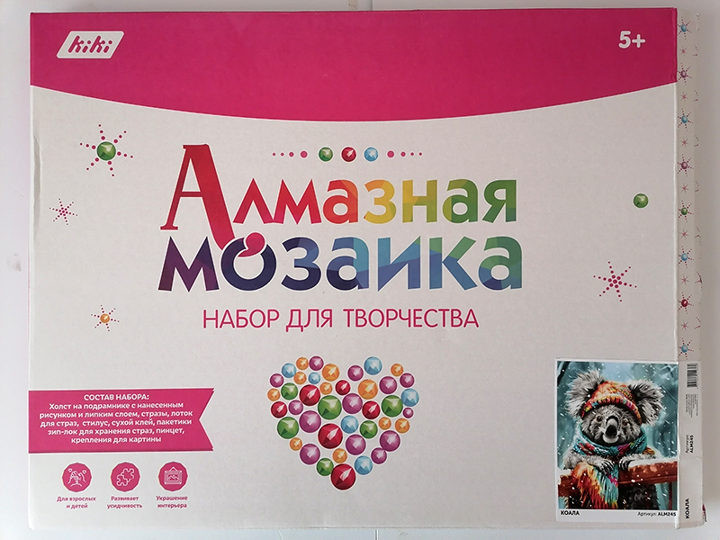 Клей держит, ттт, начала с верхнего левого угла, единственное минусовое — размер холста, неудобно держать. Опять же, из-за большого размера не получается выдержать ровные ряды, где-то получается косо, потом постараюсь линейкой выправить. Из плюсов — само изображение укреплено на подрамнике и есть какая-то плотная подложка, боялась, что ткань будет просто натянута и провисать со временем, но она проклеена и плотная, удобно. Из минусов — на промофото заклеенный рисунок уходит за края полотна. В реале же рисунок отстает от полотна, и по краю идет клеевая полоса, Которая не обозначена под номера страз, и подозреваю, что их не хватит на дополнительное обрамление, т.е. по краю так и останется пол-сантиметра клея. На который со временем осядет пыль. Подумаю, что можно с этим сделать, если останутся стразы, постараюсь ими заклеить.