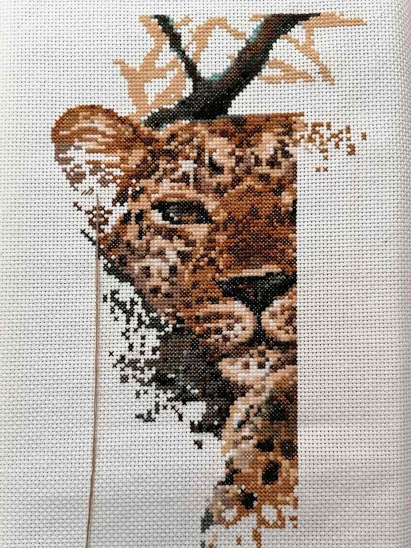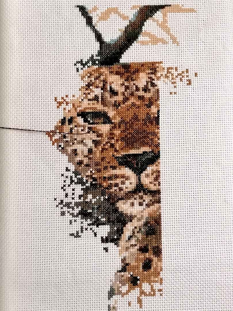 Начала набор Риолис, старый, аж 2007 года издания. Он у меня с того года числится в випах, причем история достаточно грустная — когда-то я его купила, сразу после того, как он вышел. Очень понравился. Но оказалось, что ткань была 14ct, и не слишком хорошего качества, очень рыхлая. Вышивать шерстью в три нити, тоже не слишком удобно. Плюс схема со множеством одиночек и сменой цвета нити. Плюс очень маленькие дети, и мало времени. В общем, я сделала его примерно треть, через «некогда» и «что за дурацкая схема, где я остановилась». Потом я от вышивки на несколько лет отошла, ткань с куском леопарда валялась годами, постоянно натыкалась на нее и понимала, что мятое полотно вообще не вызывает желания его дошивать. В итоге однажды психанула из-за качества ткани и того, что не понимаю, как это вообще можно вышивать и выбросила всю недоделанную работу.