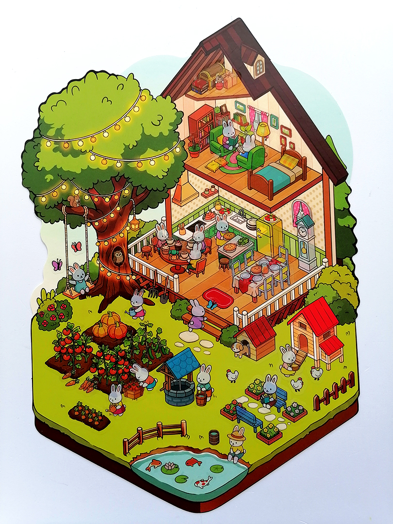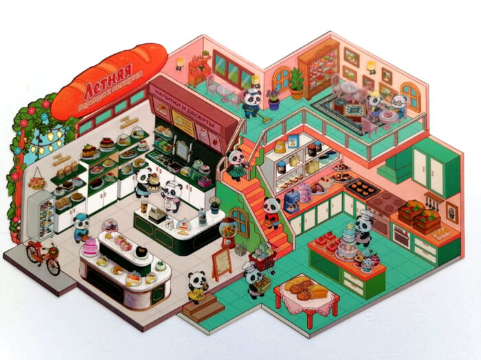 Эти мне тоже понравились, купила их все, если не ошибаюсь. В местных магазинах, по крайней мере, я других не видела. Но есть вопросики, — ферма и кондитерская со стикерами не полный комплект. В обеих нет нужного, но есть ненужное — в ферме не хватает двух стульев у стола, но есть лишние тарелки, одну их которых я поставила на холодильник, а в кондитерской вообще имеется лишнее окно, но нет много блюд для центрального стенда. Я, конечно, выкрутилась, приклеила из других, сделала свой вариант, но осадочек остался.