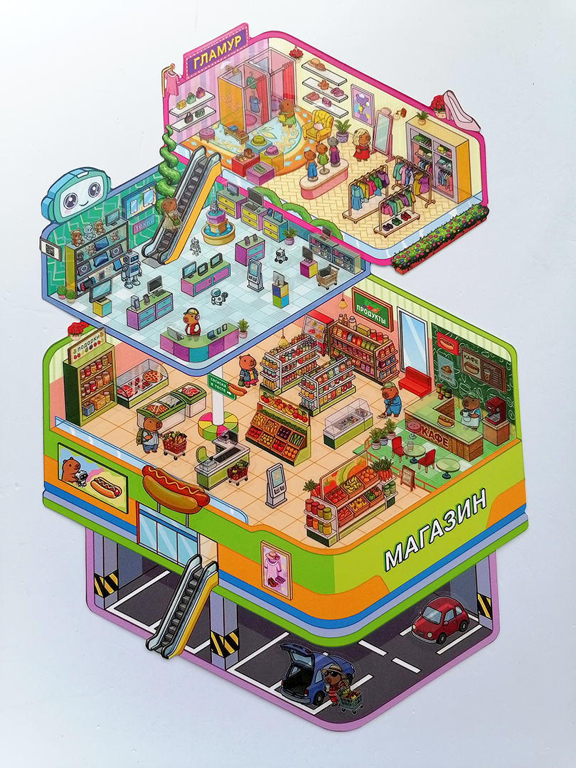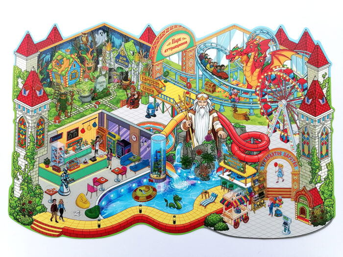 Увидела в фикспрайсе румбоксы, стикеры. Они состоят из картонной подложки, и нескольких листов стикеров. По образцу нужно воссоздать комнату или парк, наклеивая детали в нужном порядке.