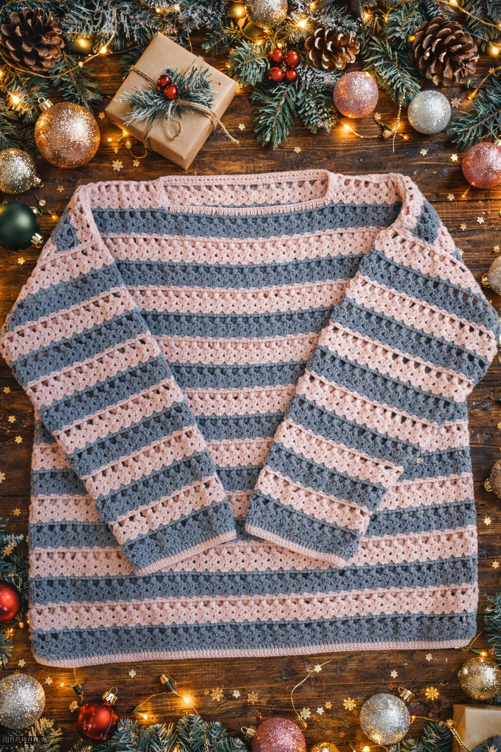 Полосатый свитер 21.12.2025 Опубликовано в Вязание Отмечено вязание крючком alize cotton gold 330 м в 100 гр, крючок 4 Вязала по фотографии из пинтерест. В оригинале это желто-серая гамма, у меня розово-серая. Вязать понравилось, рисунок простой, быстро запоминается. фото из пинтерест 12